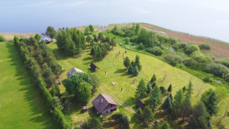 - 3 poilsiui skirtus rąstinius namus (iš viso 25 miegamos vietos, 7 miegami kambariai) su kubilais ir pirtimi: